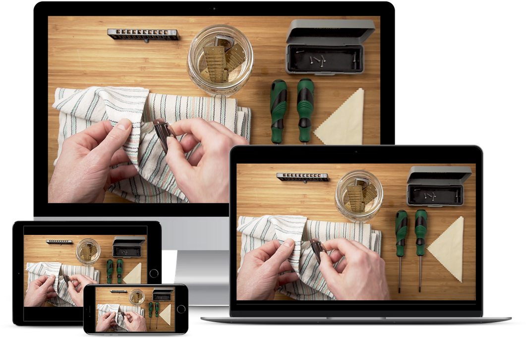 Ce cours est conçu pour que tu puisses suivre chaque étape comme si tu étais à côté de moi sur l'établi. Les angles de caméra sont pensés pour que tu voies clairement chaque détail. Les pièces, les outils et les gestes. Pour nettoyer ton harmonica en toute confiance.
